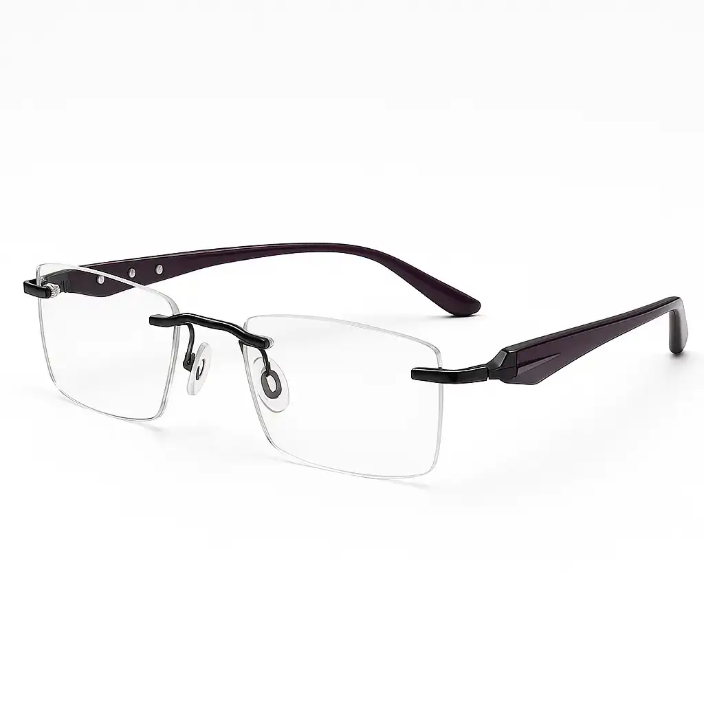 Short Description:These purple rimless eyeglasses feature a sleek square shape with a lightweight plastic frame. The vibrant purple color and minimalist design provide a modern, stylish look that suits both casual and professional settings.