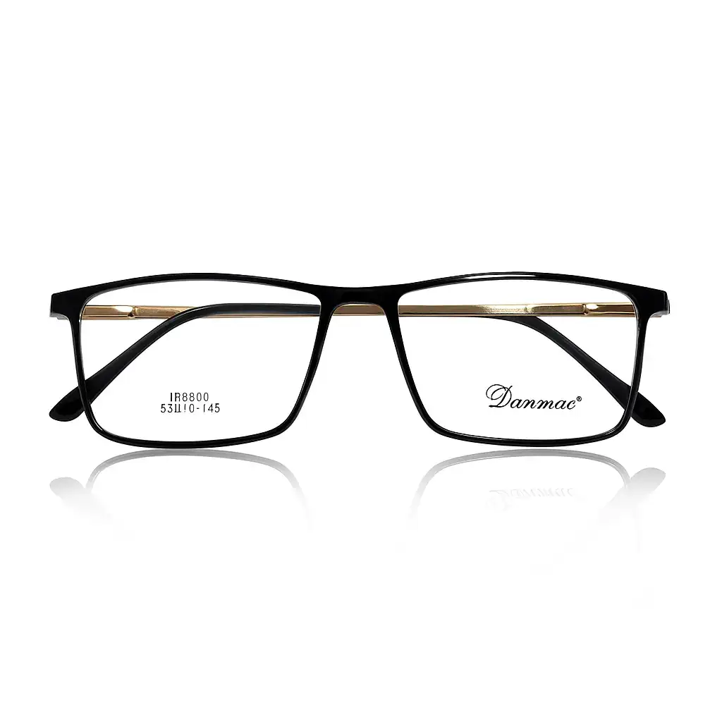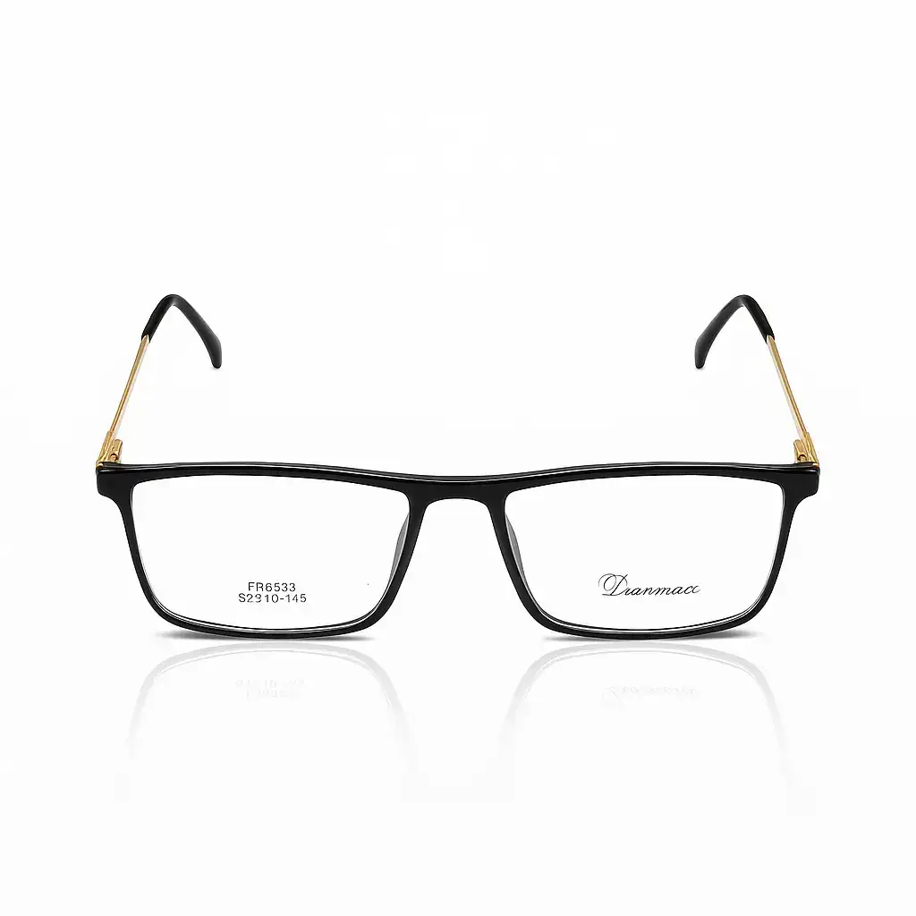 Description:Danmac introduces a classic black and golden rectangle eyeglass with a full-rim plastic frame. Offering both elegance and durability, this stylish design suits professional and casual looks. A perfect choice for those seeking timeless fashion with a modern touch.